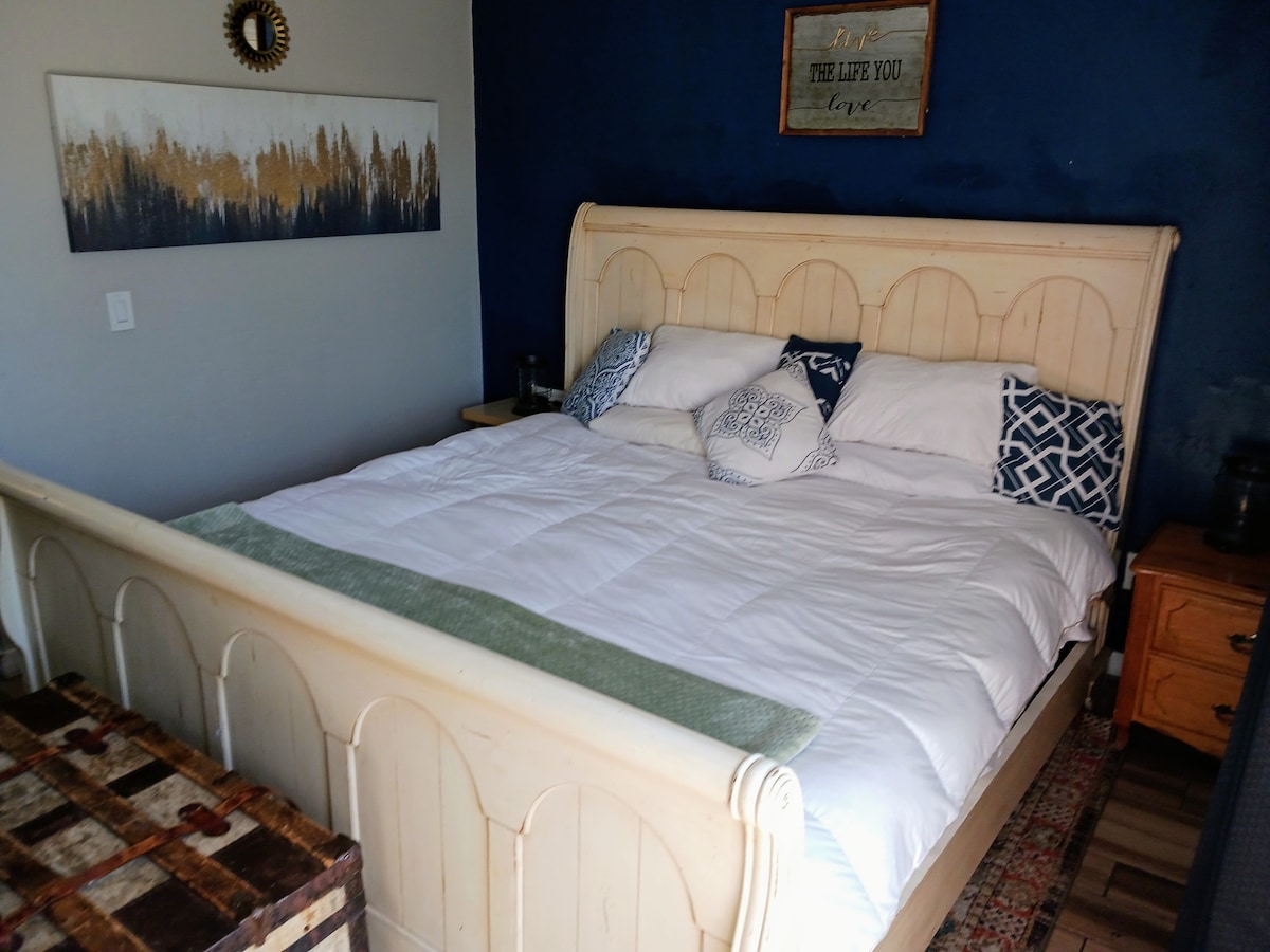 Keep it simple at this peaceful, unique,and centrally-located private getaway. Farmhouse theme with a big deck porch and views of the backyard and garden. Private pathway entrance from the street. Big soaker tub(50 gallon water heater) The electric fireplace and the led lights in bathroom create a romantic atmosphere. Fire pit, hot tub, and backyard are shared with the downstairs tenant,so please be mindful. I am in the process of updating,so any helpful critique is accepted :)I hope you enjoy!
