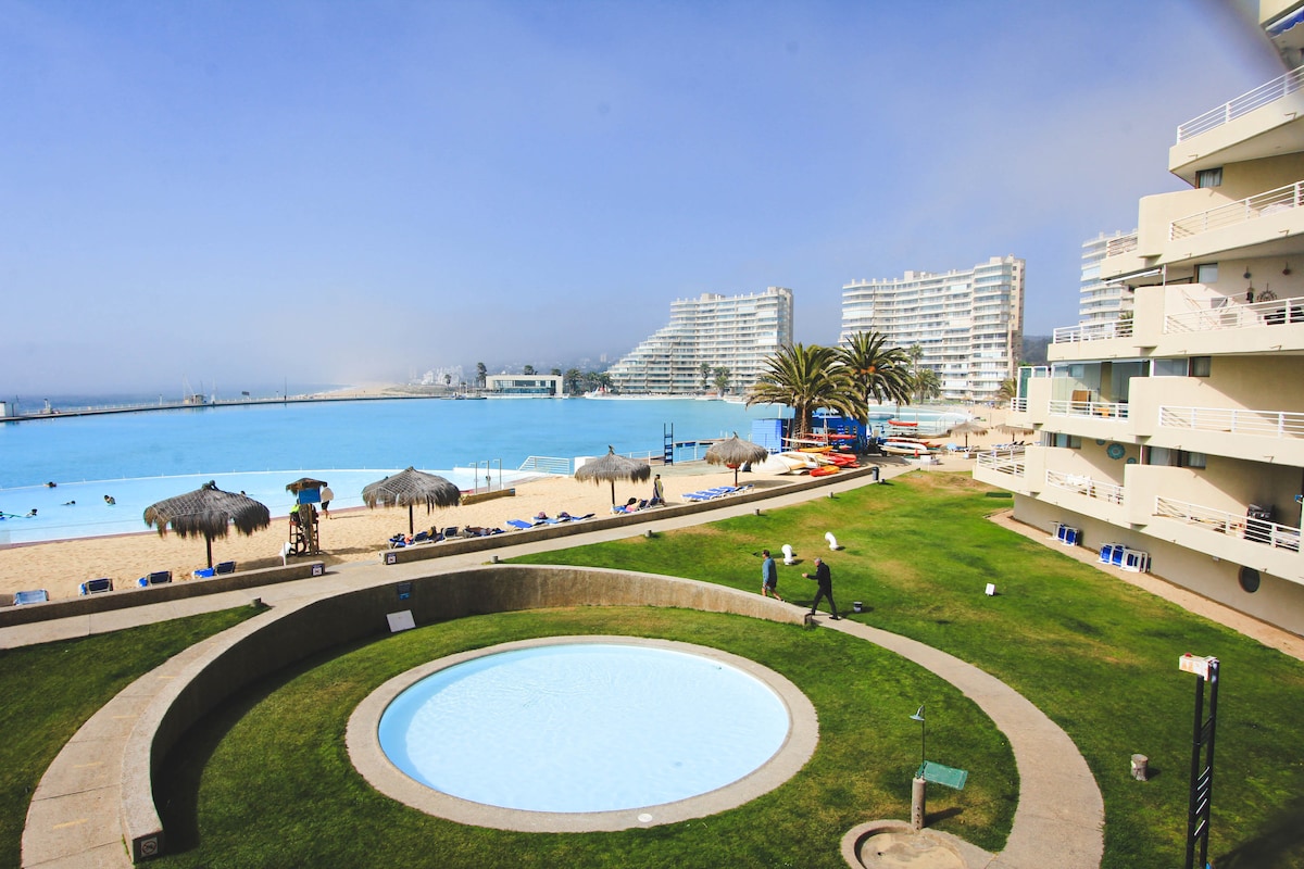 Departamento con vista panorámica. 3 habitaciones, 2 baños, 2 estacionamientos y cocina equipada. Incluye: • Wifi • 2 kayaks • 2 bodyboards • Parrilla Máximo 6 personas. El recinto tiene canchas, juegos, restaurantes y una de las piscinas más grandes del mundo para navegar y practicar deportes acuáticos. Piscinas para baño disponibles: • Fines de semana (31/10-08/12). • Todos los días (14/12-15/03). • Festivos todo el año. Piscinas temperadas y jacuzzi exclusivos para propietarios.