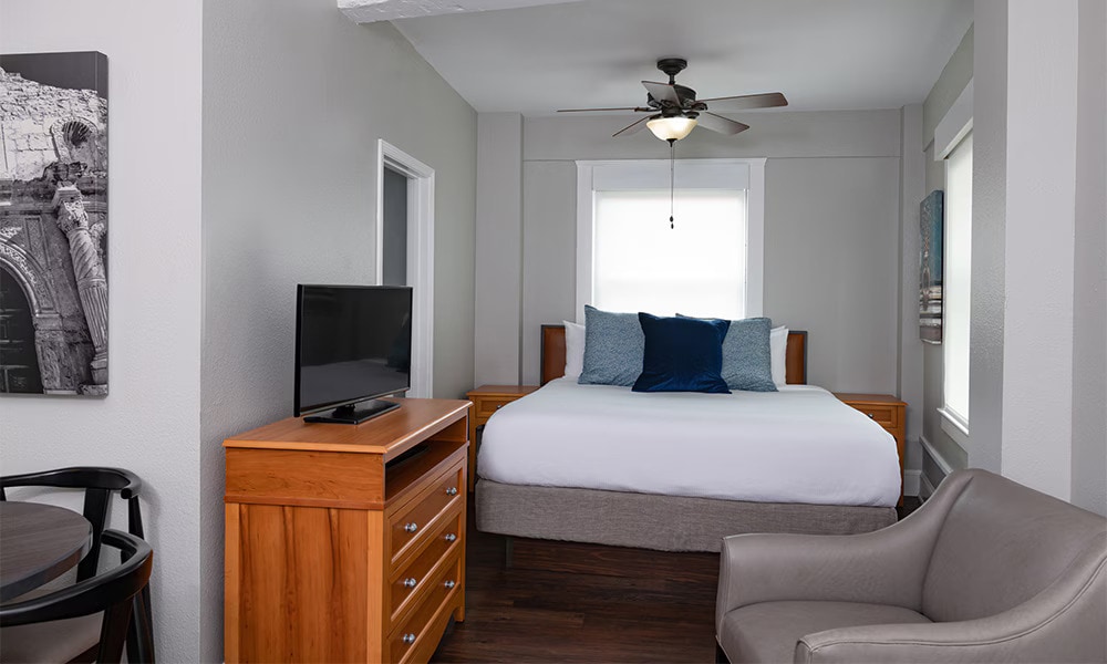 Elegante y espaciosa, nuestra habitación Deluxe King bellamente amueblada está recién decorada en suaves tonos crema y salvia y cuenta con una cama tamaño king, persianas personalizadas y vistas al Álamo o al atrio tropical. Cada habitación ofrece una cafetera Keurig, mininevera, Wi-Fi, televisión de alta definición, plancha y tabla de planchar, escritorio, secador de pelo y un paquete de amenidades premium de Gilchrist and Soames. Cada alojamiento histórico viene en una variedad de configuraciones de tipo de habitación.
