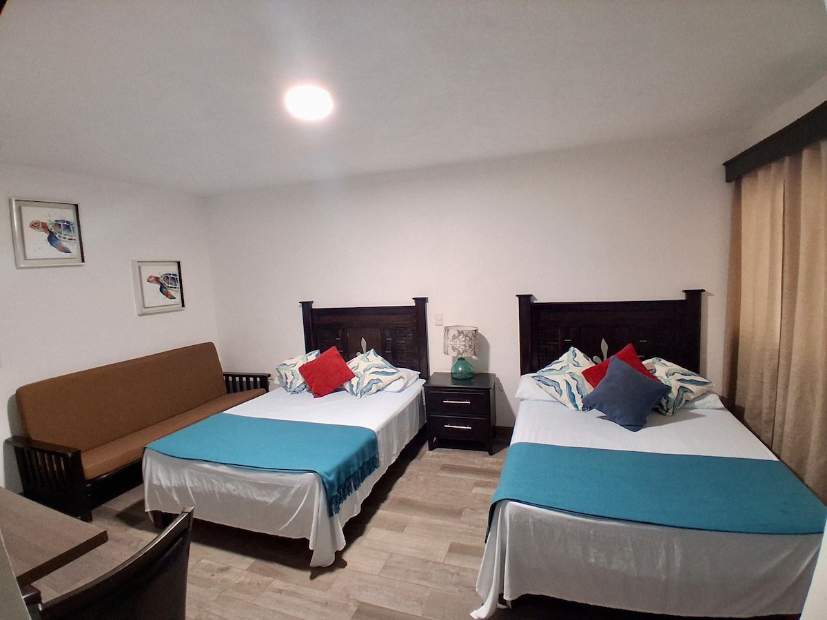 Hotel Casa Pachamama, habitación SOL, te brinda la calidez y el espacio que tu familia necesita para vivir una estancia inolvidable. Ideal para familias pequeñas. Cuenta con: •Una habitación privada, con cama matrimonial •Sala con sofá cama (2 camas individuales) •Un baño completo •Cocineta completamente equipada y comedor pequeño. Todas las comodidades (aire acondicionado, ventiladores de techo, wifi, TV, agua caliente. *El área de alberca y jardín son compartidas con otros huéspedes.