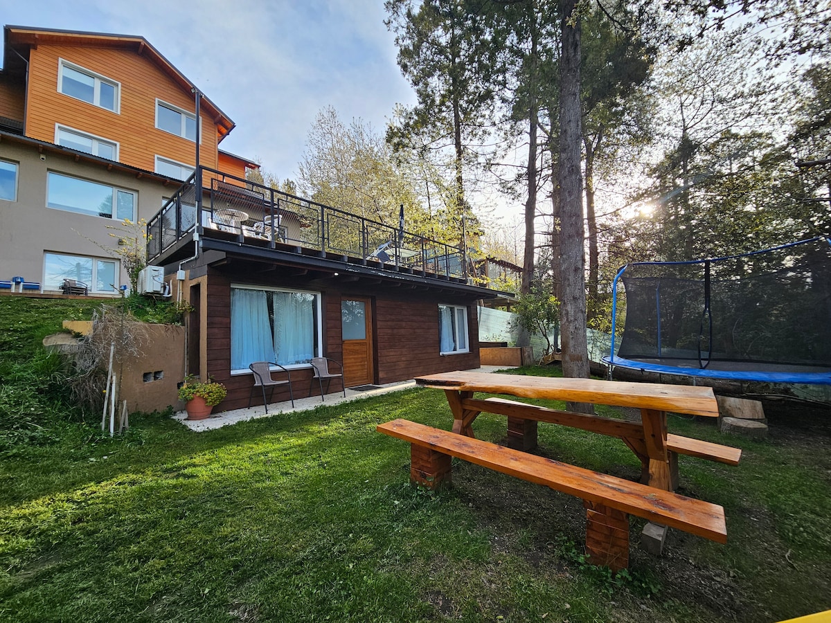 Monoambiente en Planta Baja rodeado de naturaleza y con muy buena vista al lago Nahuel Huapi. Se encuentra ubicado a 15 minutos de la ciudad. Cuenta con un Sommier King o dos Queen size individuales , un sillón que se convierte en cama simple o doble. En el mismo ambiente hay un escritorio. Cuenta con una cocina comedor amplia y completa. Tiene un hermoso y amplio balcón y un pequeño jardín. Equipado con un Smartv de 43 pulgadas, un asistente Alexa, jarra, tostadora, licuadora y cafetera.