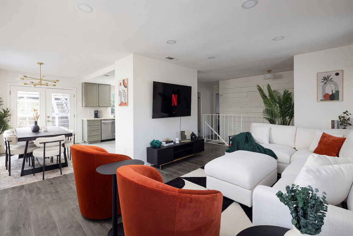 VERY PRIVATE, COMPLETELY RENOVATED 4BR 3 Bath mid-century home with heated pool, hot tub and fire pit in totally private backyard retreat. The house was redone top-to-bottom, inside/out with everything new. The beds are top quality with very high quality 100% cotton sheets and bath towels. Conveniently we are centrally located in a safe, friendly neighborhood with beautiful mountain views in the back. We never charge any fees - as we want to provide the experience we hope to get when traveling.