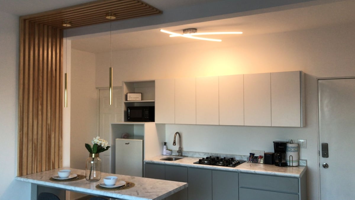 Te encantará esta escapada única y/ó romántica. Ó brindarte un merecido descanso el sensación de hogar, un lugar discreto, intimo, con detalles de una casa totalmente completa pero en pequeño, con su baño completo, sala, cocineta completa que consta de (estufa de inducción con dos quemadores, mini-refrigerador, fregadero), además de dos espacios con bancos en la barra para recibir alimento cama matrimonial, mini sala recibidor con tv y Google home, lava-secadora.