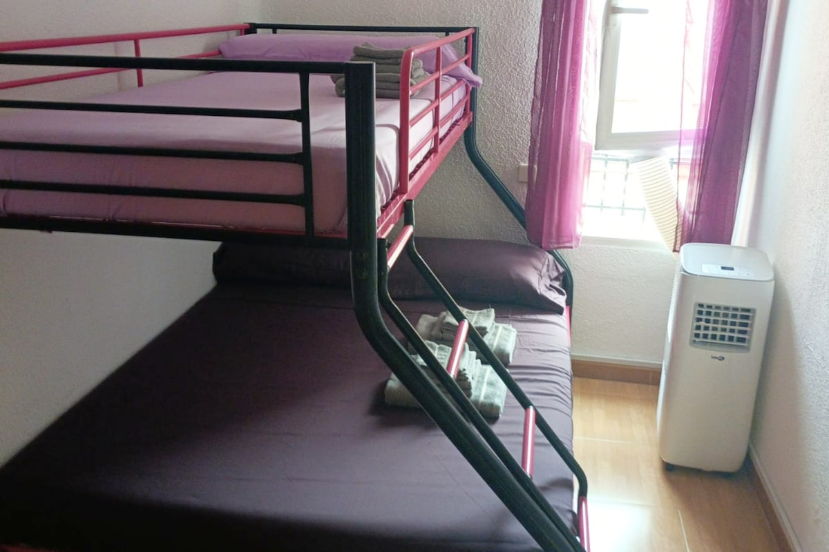 Apartamento amplio y luminoso situado en la zona de Puente de Vallecas. Cuenta con 2 habitaciones con cama de matrimonio y un sofá cama en la zona del salón, por lo que pueden alojarse hasta 6 personas. Además el apartamento dispone de aire acondicionado en todas las estancias y los huéspedes puedes disfrutar también de un patio exterior para relajarse después de una jornada conociendo la ciudad. La parada de metro de Nueva Numancia está situada a 3 minutos a pie de la propiedad.
