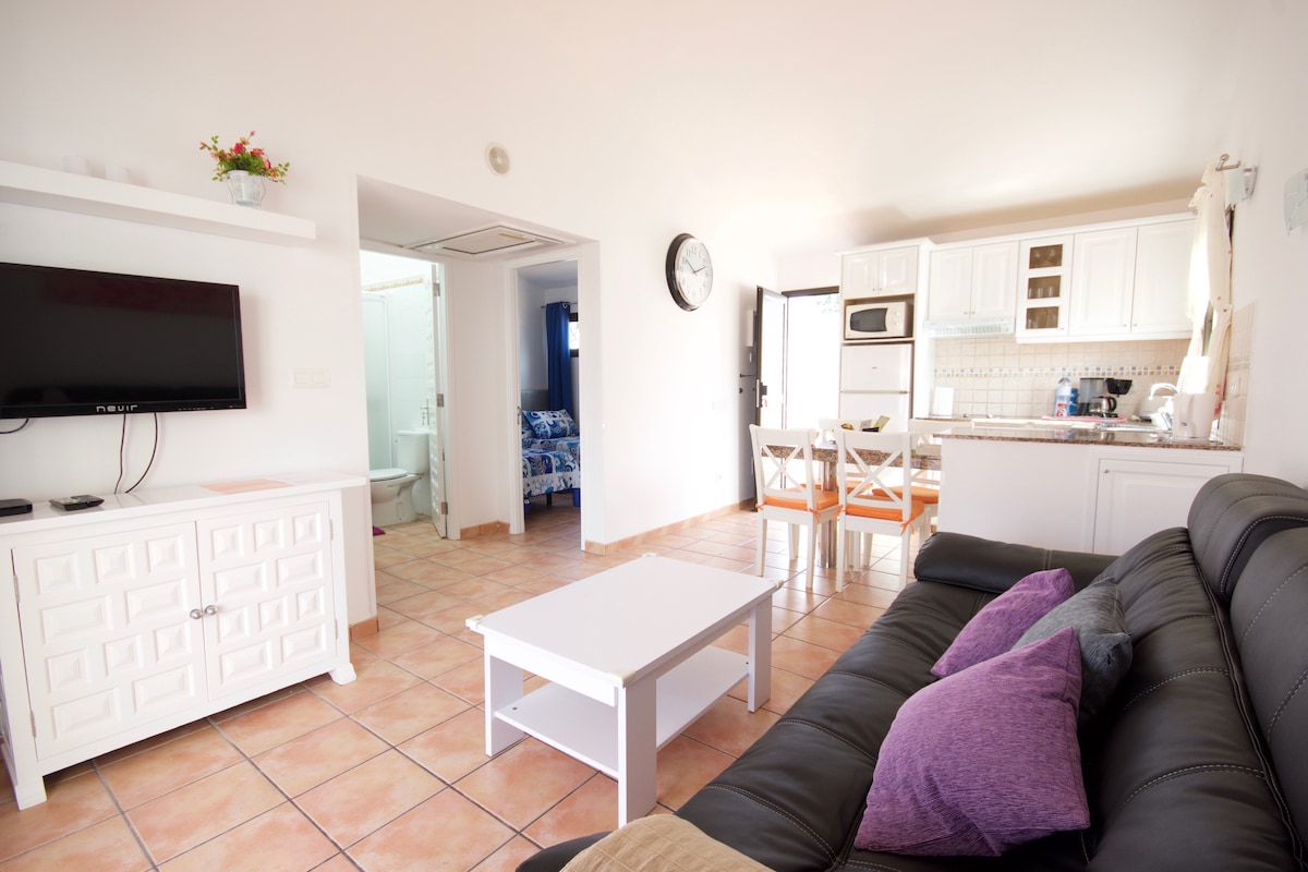 Aire acondicionado, smart TV 55" fibra internet.En una zona muy céntrica y tranquila. Acogedor con sala de estar con sofa cama y dormitorio con cama de matrimonio, cocina y baño independiente, dispone de un restaurante todo dentro de un hotel. Ubicado frente a un centro comercial con farmacias ,mercados, restaurantes, discotecas y al lado de la playa. Situado en el sur de la isla en unos de los puntos más turisticos y visitados. Dispone de Piscinas una para adultos y otra para niños