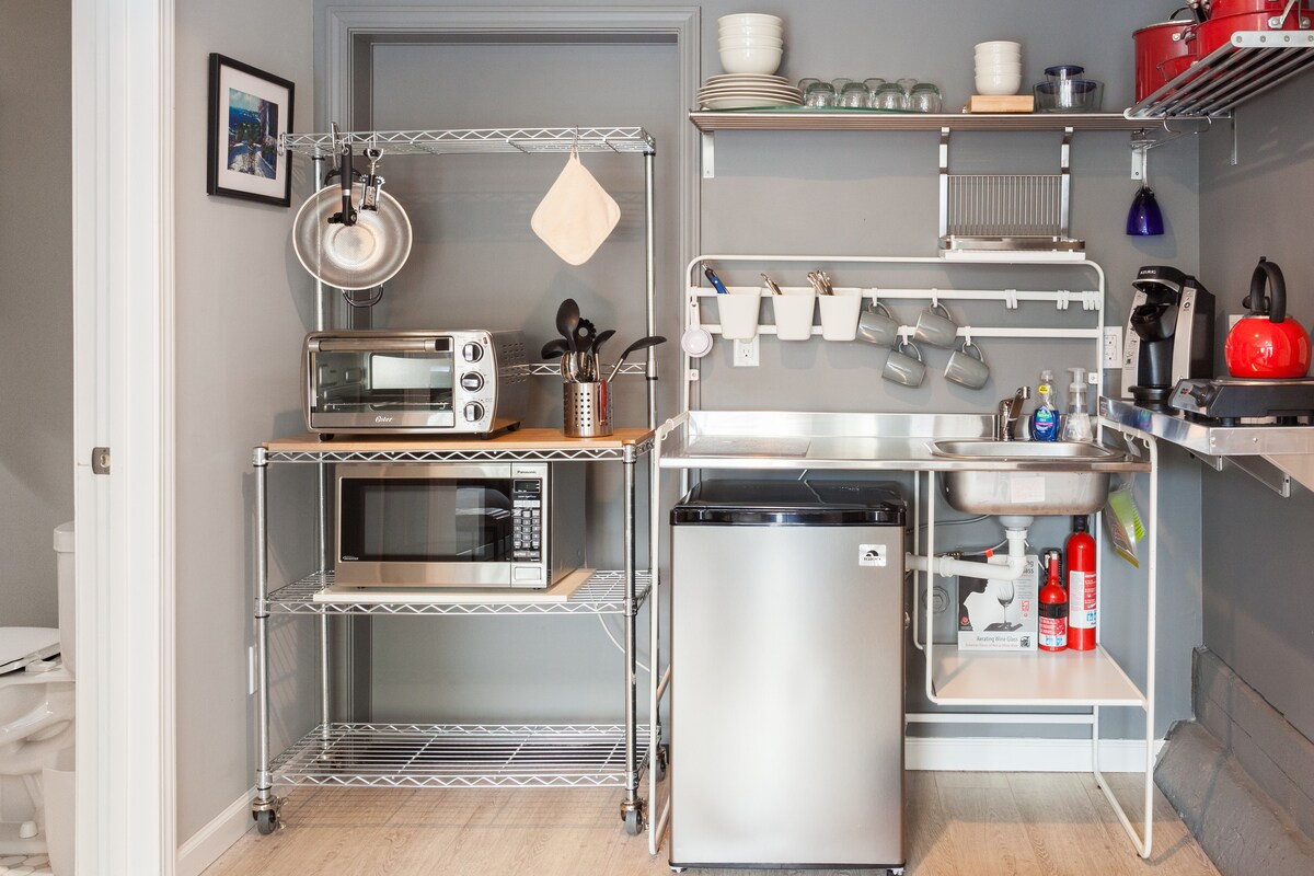 El gran estudio (380 pies cuadrados) se encuentra en un vecindario residencial tranquilo. Con su propia entrada a través del garaje, puedes hacer el check-in/check-out autónomo. Tendrás acceso a tu propio baño y cocina pequeña (estufa eléctrica doble), horno tostador, microondas, nevera pequeña y lavadora, secadora en la unidad. No tiene ventilación, por lo que la cocina limitada es preferible Es un espacio ideal para parejas, aventureros solitarios, viajeros de negocios y familiares pack-n-play está disponible Apple TV y cable estándar No se permiten animales No hay estacionamiento.