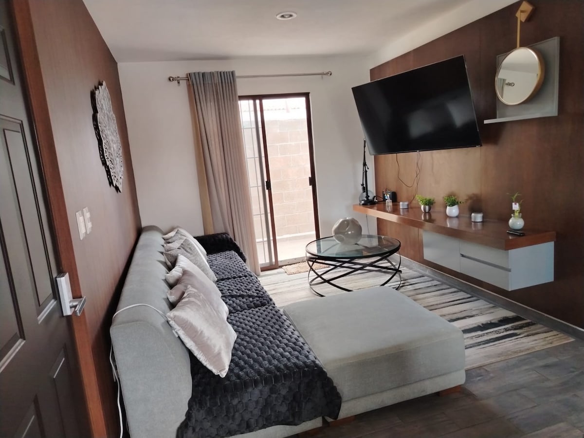 Bonito departamento con terraza en segunda planta con una cama King size, un sofá-cama y un sofá. Contamos con pantalla S-Mart TV para que puedas acceder a tus plataformas preferidas. El departamento se encuentra cerca de las avenidas principales de la ciudad, por lo que facilita el acceso al centro histórico, así como la movilidad al sur de la ciudad. Cuenta con cochera techada y portón eléctrico. Hay todo tipo de comercios a menos de 5 minutos caminando. ***Facturamos tu estancia***
