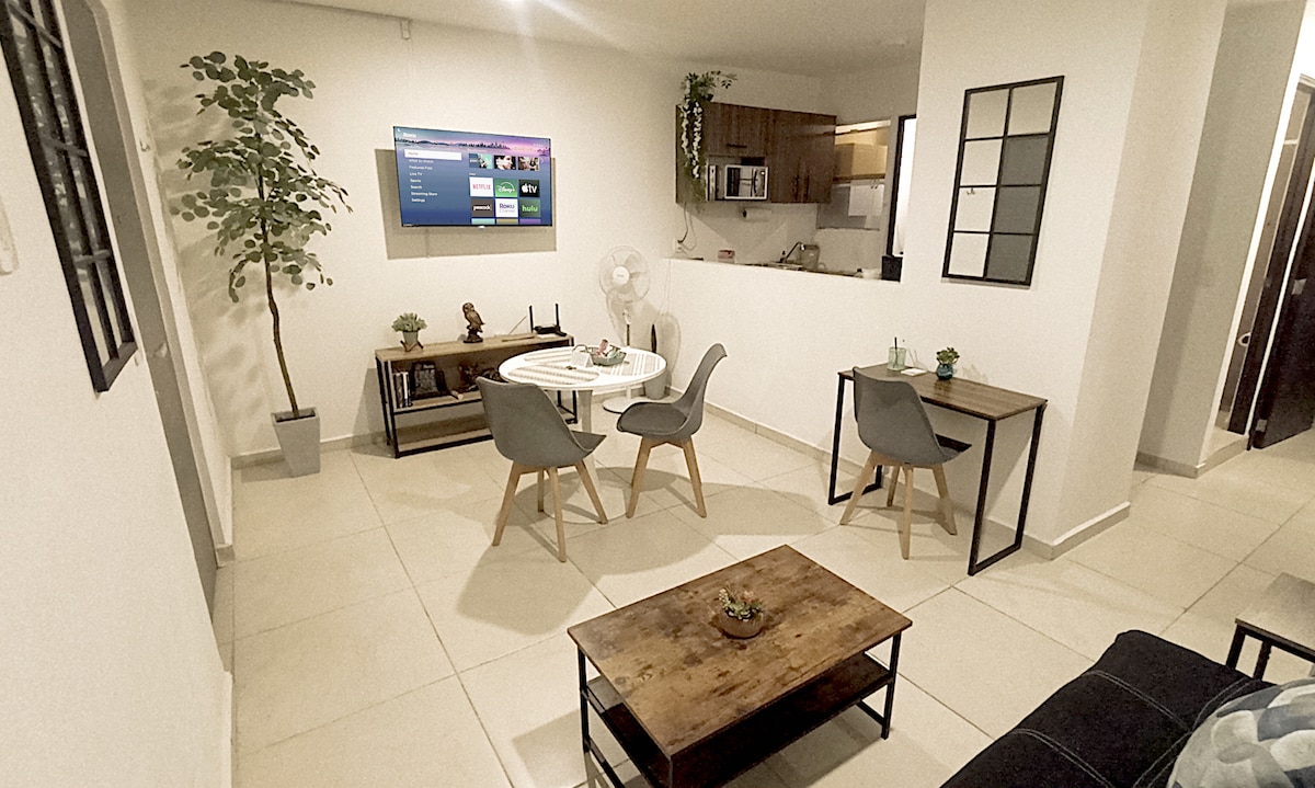 Departamento entero solo para ti! 🏡✨ Un espacio con diseño y toques acogedores que te harán sentir como en casa. Cada rincón fue pensado para que disfrutes al máximo tu estancia 🛋️ No estamos en el centro de Guadalajara, ¡pero llegar es súper fácil! 🚗🚌 Además, estás a solo 10 min del Centro de Tlaquepaque, donde puedes disfrutar del mariachi, artesanías y la deliciosa comida típica de El Parián 🎺🌮 El depa cuenta con aire acondicionado ❄️ ¿Viajas por trabajo? También emitimos factura 💼🧾