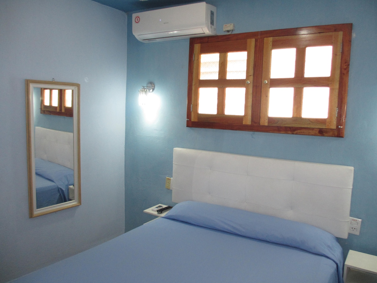 Moderno, independiente, situado en planta baja, consta de recibidor-cocina- comedor, habitación con cama doble extra grande, baño privado dentro de la habitación, agua caliente, Split, ventilador, caja de seguridad, televisor, wifi. Cocina completa, refrigerador, microondas, cocina eléctrica, olla multiproposito, cafetera eléctrica, freidora aire y aceite . Se permiten visitas. Se preparan desayunos. Acceso a la terraza. De fácil acceso a los principales lugares de la ciudad.