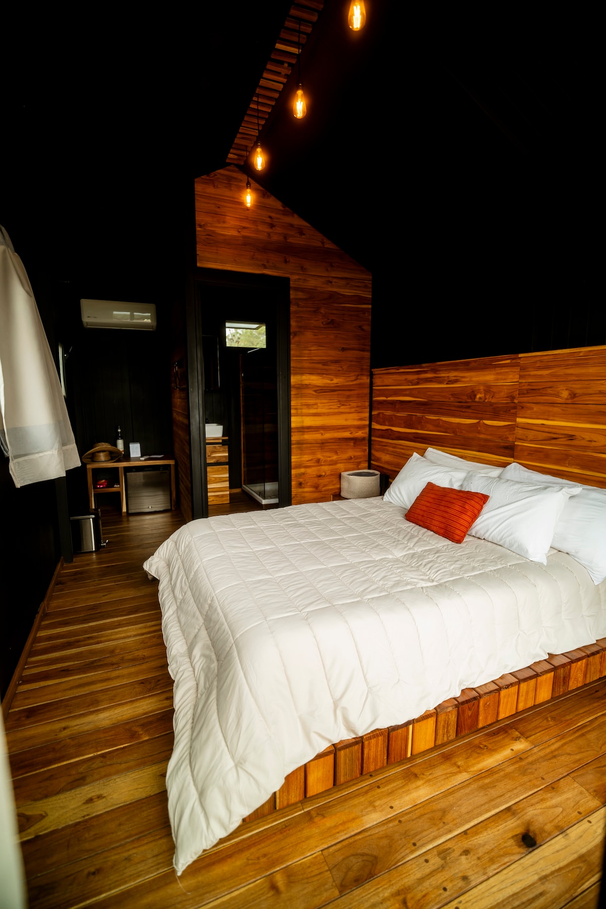 Relájate en esta escapada única y tranquila, cabaña con cama queen size, baño completo, aire acondicionado, tina de hidromasaje exterior y amenidades. En el hotel contamos con servicio de transporte, restaurante y áreas comunes como fogateros, pergolados y asadores.
