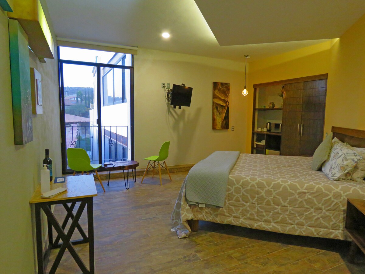 Vive la experiencia de hospedarte en nuestra cava subterránea, a solo 7 min del centro ,cuenta con un diseño único en peña de Bernal ,temático y vintage, con cama kingsize y sofá-cama, aire acondicionado (frío-caliente) ; tina amplia para 2 personas , 2 pantallas con servicio de Sky , baño completo , sala de cata de vinos privada con frigobar, cafetera y horno de microondas. Disfruta de Bernal y los viñedos que hay en la zona y termina tu aventura en nuestra cava. Te va encantar.