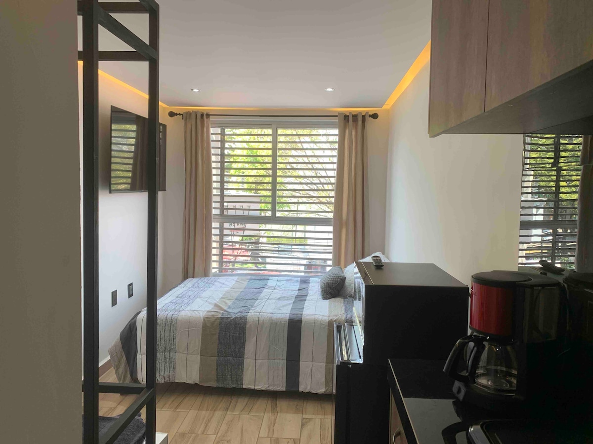 Estudio completamente privado y muy acogedor. A unas calles del centro y a unos pasos de las dos avenidas más importantes de la ciudad (Reforma e Insurgentes). Está en un condominio de más de 100 años, catalogado por su valor arquitectónico. Remodelado hace unos meses. Techos muy altos. Cómodo y silencioso. A cinco minutos del Monumento a la Revolución.