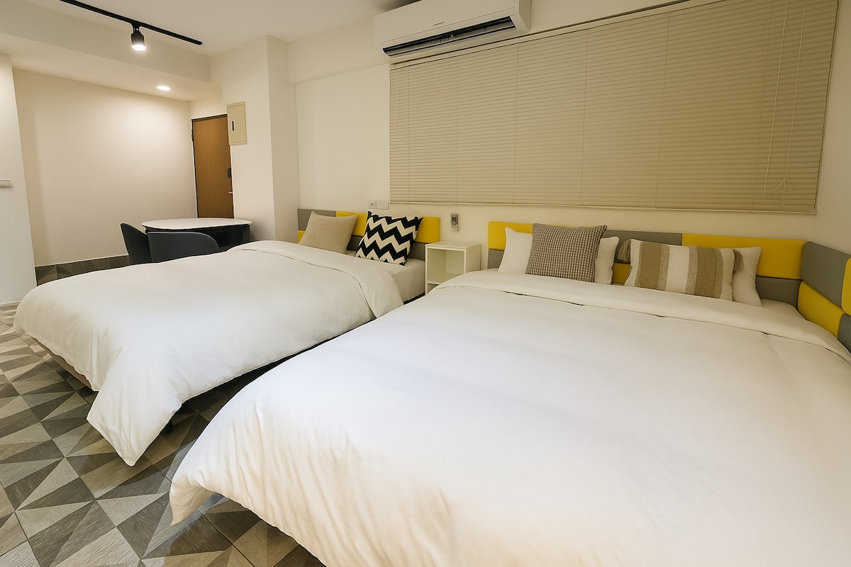 📍 Cómo llegar 1. En taxi: a unos 30 minutos del aeropuerto de Taoyuan. 2. En el aeropuerto MRT: a la estación de la escuela primaria Sanchong (60 minutos) a → 5 minutos caminando del apartamento. 📌 Antes de reservar: ¡ten en cuenta! Tercer piso sin ascensor : suite privada con dos camas dobles y baño privado. 2. Edificio superior con insonorización limitada. Mantén el volumen bajo por la noche. 3. ¡Una introducción rápida ayuda! Cuéntanos de dónde eres, tu hora de llegada y con quién vas a viajar