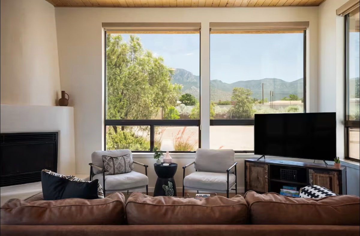 Una suite de invitados completamente privada de estilo suroeste (sin cocina) con vistas increíbles, rincón de café, piscina, spa, chimenea al aire libre y barbacoa, todo en un acre completamente vallado. Tu ala de 2 pisos completamente privada con entrada independiente incluye 2 dormitorios y baño completo en la planta baja. Arriba hay una gran habitación abierta con chimenea, sofá cama y una gran terraza con vistas a ABQ. Una pared insonorizada separa la suite privada de invitados de la casa principal con estacionamiento seguro dentro de la propiedad vallada.