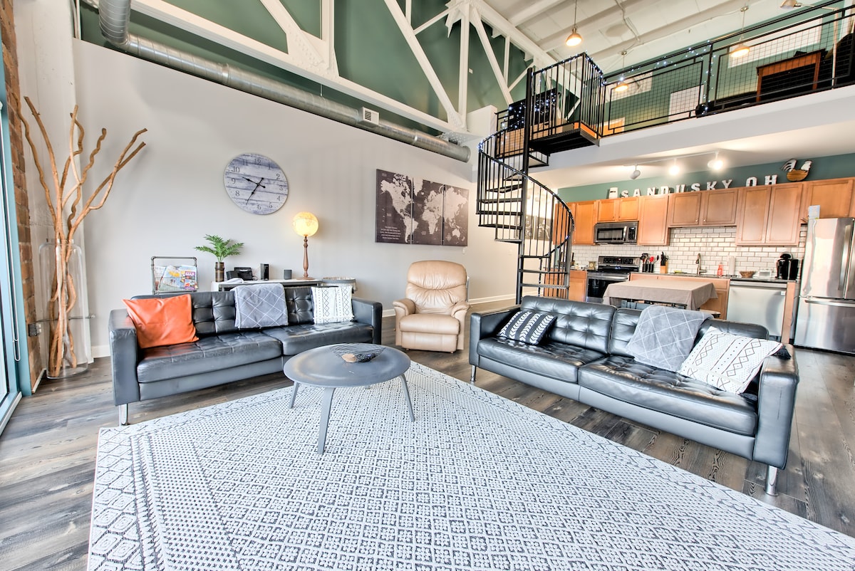 Want a getaway along the Lake Erie Shores, then you have found it! Our historic newly renovated spacious condo comes with everything you would want. The joint living, dining, workstation, and kitchen area boasts one of the largest living areas in all of the Lofts.Its location is ideal, next to the Goodtime cruise ship and Jet Express for a quick ride to Kelley’s Island and Put-in-Bay, and within walking and biking distance to many restaurants and attractions…and a short drive to Cedar Point!
