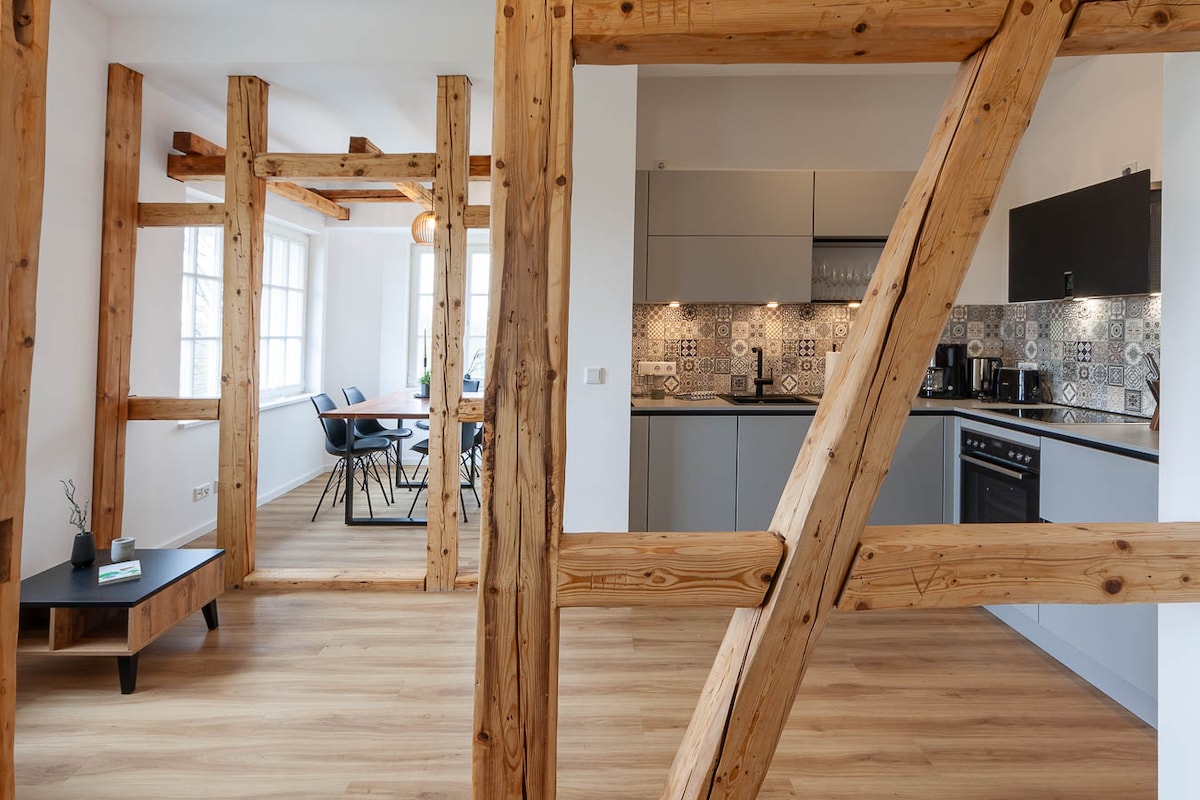 *Oferta de Año Nuevo: 20 % Impuesto turístico incluido | Wifi y Netflix Perfecto para parejas, familias y grupos pequeños. Apartamento en Wernigerode Siéntete como en casa en este hermoso apartamento dúplex en el corazón de la ciudad justo al lado del ayuntamiento, que se destaca debido a la construcción de entramado de madera con vigas abiertas y el elegante diseño interior. El departamento de 3 dormitorios ofrece 2 dormitorios con lujosas camas con somier, 1 sofá cama, una cocina totalmente equipada, TV inteligente de 46", café, té y Wi-Fi.