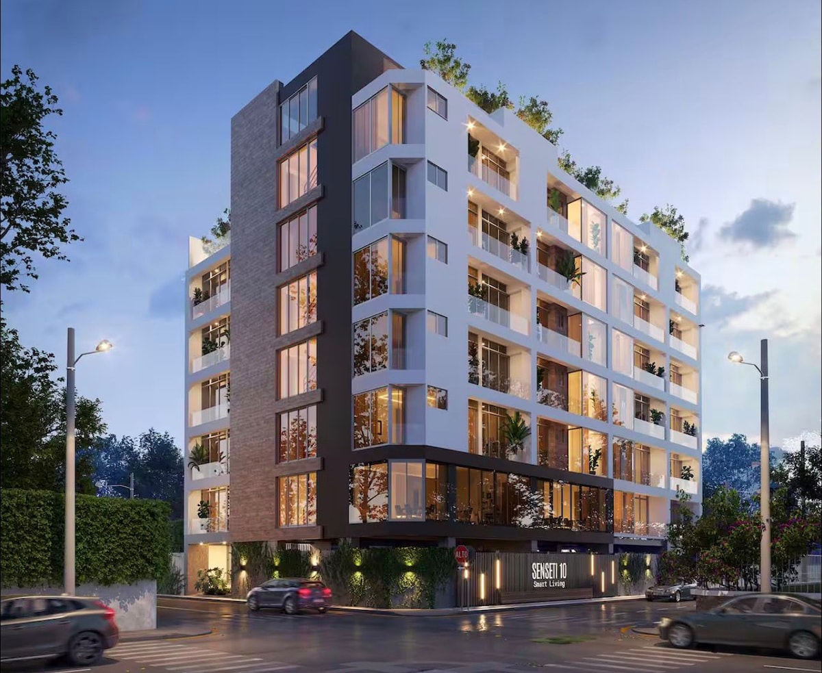 Este bello, cómodo y seguro alojamiento cuenta con una cama, sofá cama, habitación principal, cocina, comedor, sala, walk in closet, un baño y un balcón con una bella vista. Incluye televisor, utensilios de cocina, agua purificada y más. Contamos con 2 toallas, papel higiénico, sábanas y almohadas. Es un espacio inteligente por medio de Alexa permitiendo controlar luces y otros comandos por voz. Entre las amenidades está la azotea, gimnasio, bbq corner, coworking, fire pit y área de juegos.