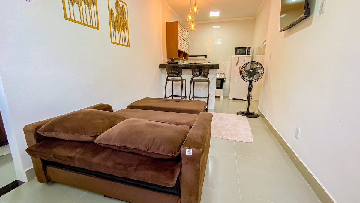✅ VALOR COMERCIAL EN TEMPORADA ALTA PARA MÁS DE 3 PERSONAS La villa disfruta de comodidad y practicidad en este APARTAMENTO para un máximo de 5 personas en el Boulevard da Praia Hotel en Porto Seguro. Se encuentra a solo 100 m de la playa de Taperapuã y cerca de la tienda de campaña Axé Moi. El apartamento cuenta con dormitorio con aire acondicionado, capacidad para hasta 3 personas ( 1 cama doble y 1 individual o 3 camas individuales) y sala de estar con un sofá cama para 2 personas y un ventilador de techo. ¡Ideal para relajarte y disfrutar de lo mejor de Bahía !