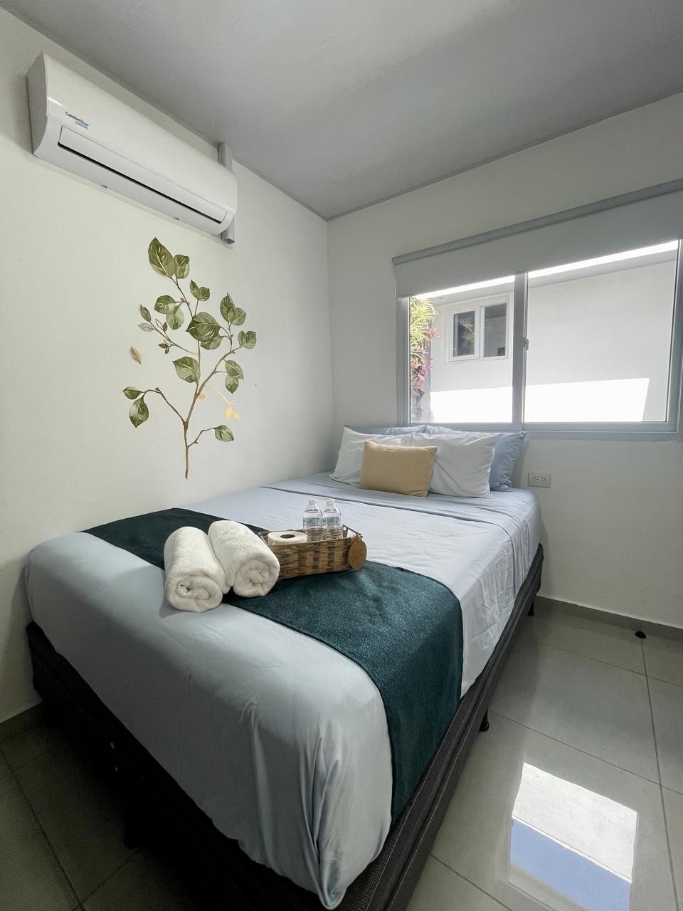 Nuevo, acogedor y moderno apartamento en zona centrica de la cápital, con detalles turquesa. Tiene bonita vista hacia la ciudad y un balcón único. Se encuentra en el nivel 6. Esta muy bien equipado con todo lo necesario para una estadía placentera. Con Wifi rápido, Smart TV ,agua caliente, aire acondicionado, cocina con todo lo indispensable. Piscina, gym, rooftop y más Muy bien ubicado, a menos de 5 minutos de los centros comerciales más grandes, restaurantes y bares. Zona segura y exclusiva