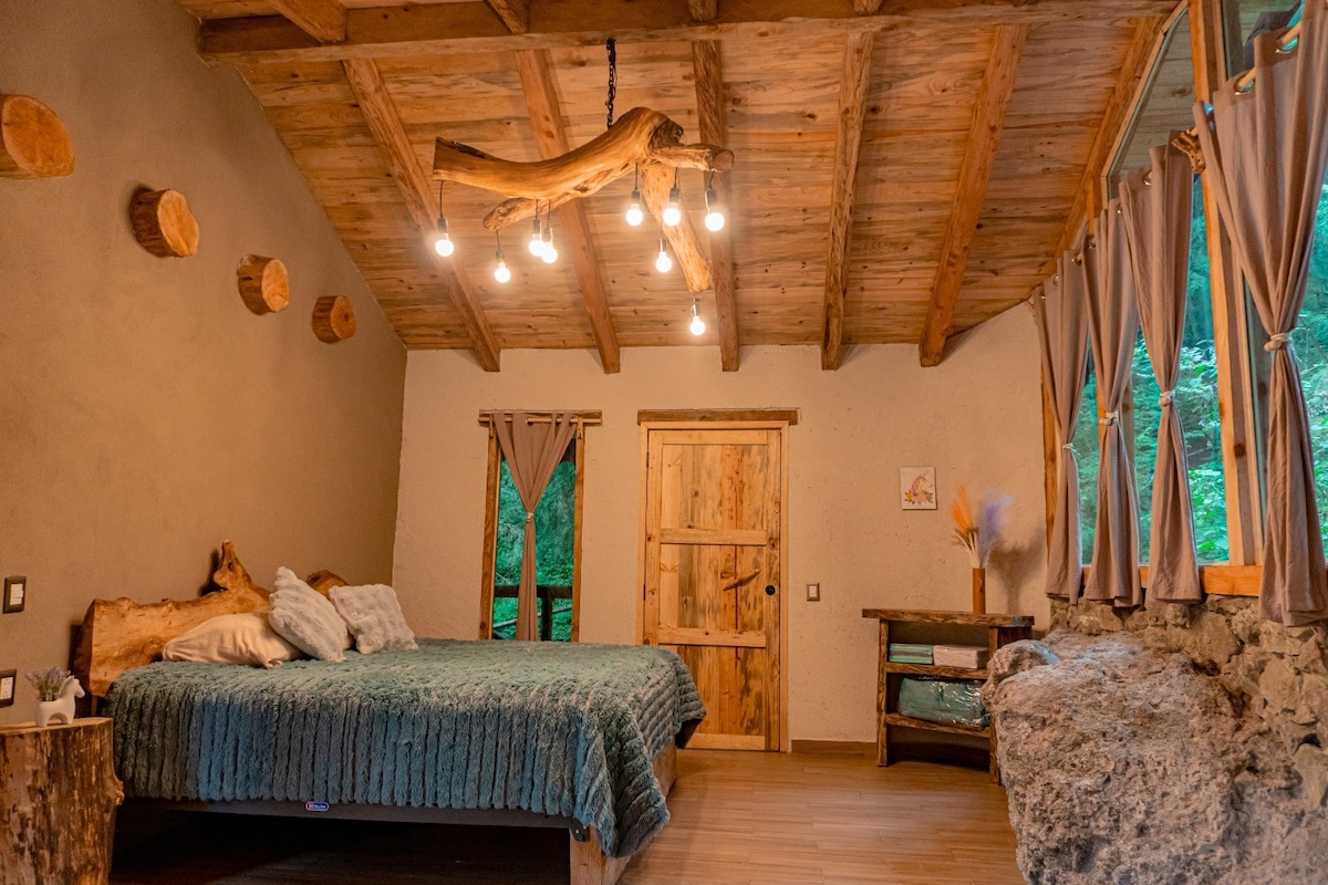 Ven y conoce la más bella cabaña Boutique del Parque Nacional del Chico, arquitectura moderna donde se funde el hierro, la madera y el barro cocido, en medio de un bosque rico en oyameles , ocotes y fauna silvestre. Un lugar lleno de quietud y paz que hará relajar tus sentidos y donde por las noches sentado al fuego de la chimenea y un par de copas de vino harán una velada romántica inolvidable o por las mañanas ver juntos el amanecer en nuestro increíble mirador hará de tu visita tu lugar ideal
