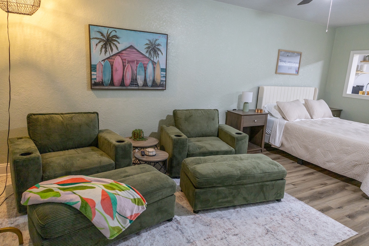 Escapada romántica perfecta con cama tamaño king, bañera de hidromasaje grande y ducha doble. ¡Ubicado a pocos minutos del aeropuerto, el centro de la ciudad y la playa! Distancia a pie a algunos de los establecimientos gastronómicos más únicos de Pensacola. Entrada privada con acceso sin llave. Proporcionaremos todo lo que necesitas para un día de playa: sillas, sombrilla, toallas de playa y nevera. Televisión de pantalla grande e internet de alta velocidad. La suite NO tiene cocina. ¡PROHIBIDO FUMAR!