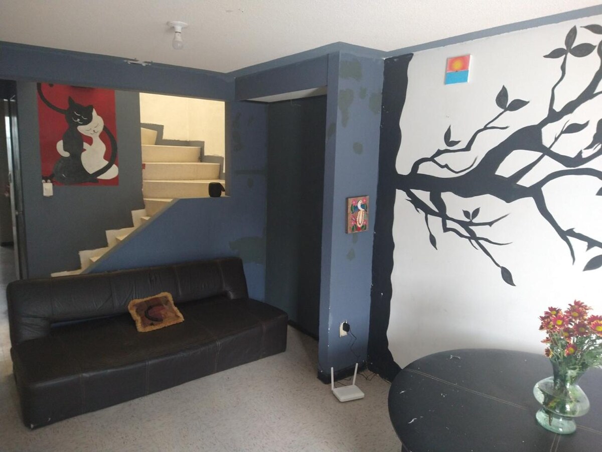 Bonito y muy acogedor departamento pequeño para que disfrutes una estancia tranquila para trabajo o descanso ,cercano a centros comerciales ,Bancos, tiendas, Aeropuerto AIFA, Barberías, Paseo ventura, plaza las Américas, todas las vialidades cercanas. etc. Disfruta de este alojamiento que cuenta con calentador solar, parrilla de inducción, Smart tv de 58pulgadas,cama matrimonial así como de la calidez y estilo que brinda el alojamiento .Siéntete seguro dentro de este alojamiento.