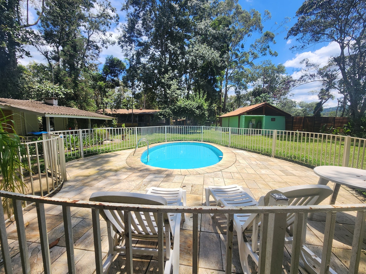 Coleccione recuerdos y vuelva a conectar con el bosque. Cabaña ideal para el descanso y el ocio en Juquitiba, rodeada de Mata Atlántica. Piscina y zona deportiva. Pista de atletismo. Espacio gourmet y zona de fogata, senderos por el bosque. Piscina natural exclusiva en medio del bosque. Represas, rafting y cascadas en las cercanías. Parque infantil. Fácil acceso - a 2 km de la carretera. Pet Friendly. Seguro y acogedor para LGBTQI+. Wifi en el sitio. Desayuno casero sencillo los fines de semana y feriados.