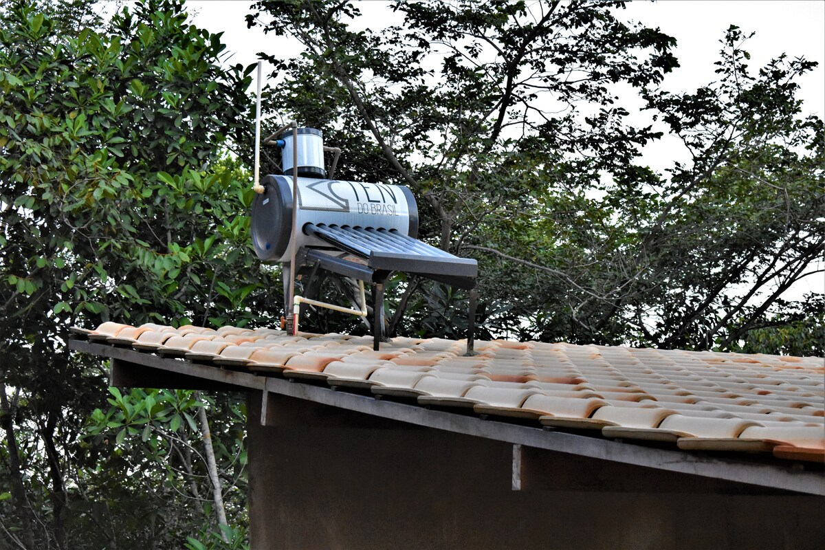Bungalow con acogedora suite con techo y suelo de madera, aire acondicionado, cómodo baño con calentador solar; balcón con mesa y hamaca; quiosco con nevera , barbacoa, estufa eléctrica, fregadero y mesa, todo equipado para preparar tus comidas; ¡ducha y tumbona! Nos gusta compartir la tranquila y acogedora vida rural con personas que son amantes de la naturaleza y vienen a descansar en un lugar seguro y familiar, ya que somos una pareja que vive en el sitio.