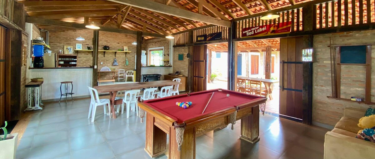 Construimos este chalet en el terreno de nuestra casa, en Vila Ecológica Santa Rita, en el corazón de Demetria, en Botucatu-SP. El proyecto fue ideado por el Bioarquitecto Tomaz Lotufo. Utilizamos maderas y ladrillos de demolición, y Mariana Cintra, nosotros mismos y el equipo de Athias construimos muros de adobe, ¡con un acabado impecable! Ubicación tranquila, cocina equipada, dormitorio con cama doble, baño privado anexo a la casa, balcón con vista al atardecer, mata de cerrado y sendero ecológico.