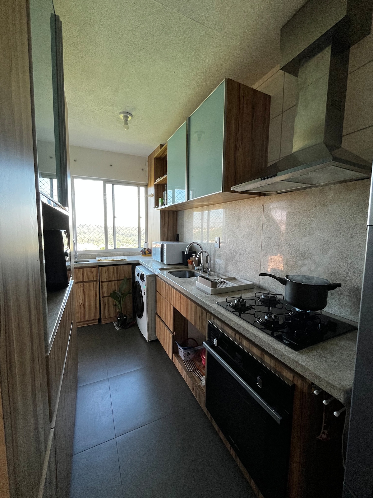 Acogedor apartamento con todo lo necesario para sentirse como en casa, moderno y cómodo. Condominio seguro con piscina, parque infantil y estacionamiento. El lugar: Apartamento totalmente equipado para los amantes de la cocina, bien ventilado, buena iluminación, tiene dos dormitorios con dos camas dobles, ventiladores, aire acondicionado en un dormitorio, ropa de cama y toallas, mantas y dos colchones adicionales. Wi-Fi, TV inteligente con Netflix, cómodo sofá, mesa de comedor para cuatro.