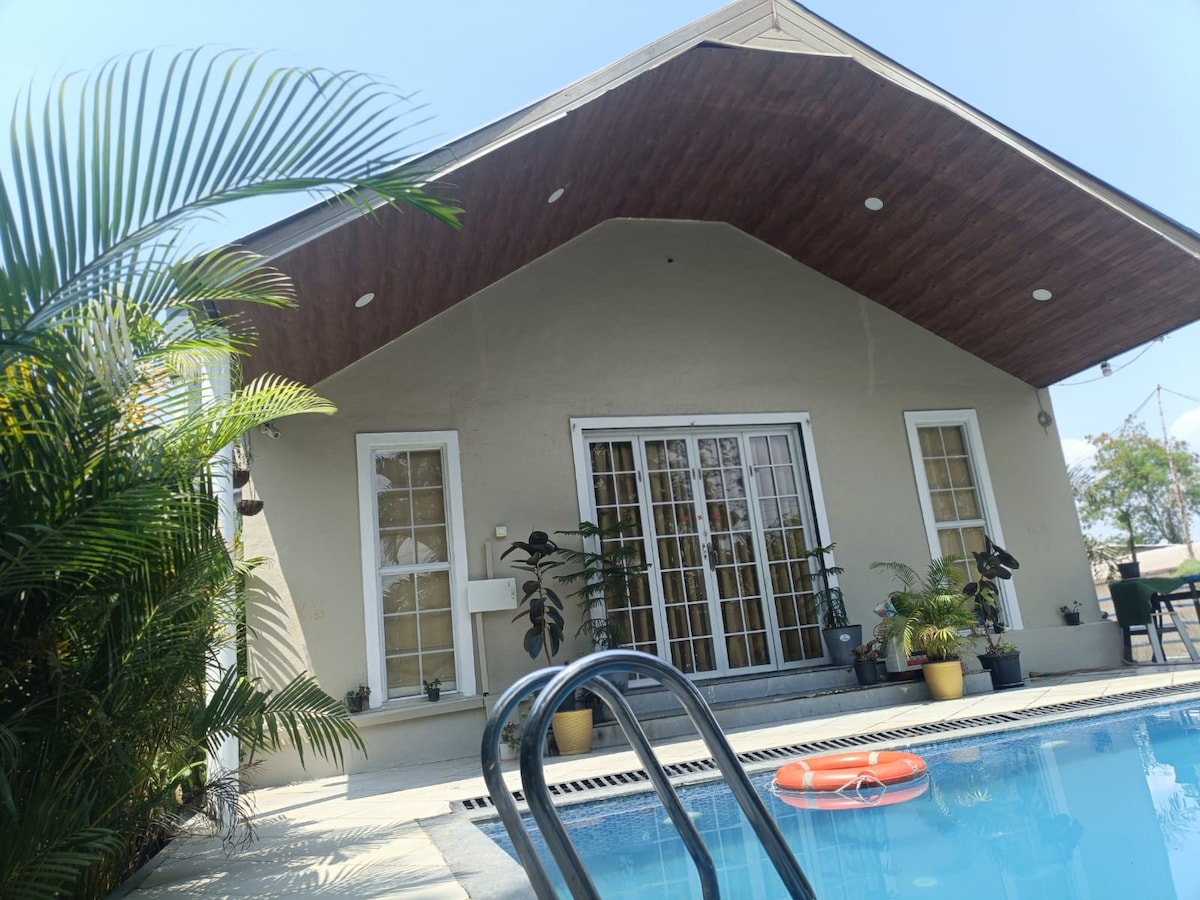 Una villa palaciega de 5 dormitorios con aire acondicionado, camas tamaño king, sala de estar grande, para alojar familias grandes y grupos. Se permite un máximo de 20 huéspedes, incluidos niños. Todos los dormitorios tienen baños grandes adjuntos + 2 baños adicionales. La villa tiene PISCINA PRIVADA + JARDÍN con hermosas plantas florales ornamentales y árboles frutales, amplios céspedes abiertos y un gran CENADOR. Juegos de interior como tenis de mesa, carambola, ajedrez y futbolín están disponibles junto con TV y TataSky.