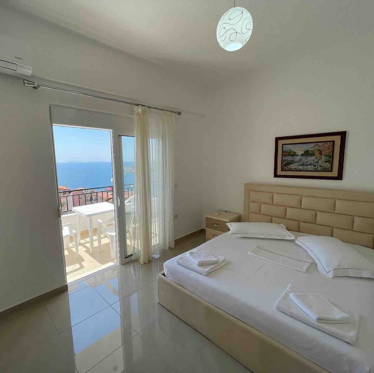 Welcome to our seaview villa in the heart of Sarande, ideal for large families, couples, or groups of friends. This spacious 5 bedroom home offers privacy, each bedroom featuring its own kitchen and bathroom for maximum comfort and independence. Rooftop terrace with uninterrupted Ionian Sea views, BBQ, and hanging chairs to relax under the stars. Located in a peaceful yet central area, the villa is just a short walk to the beach and promenade. Note There is no living room Parties not allowed