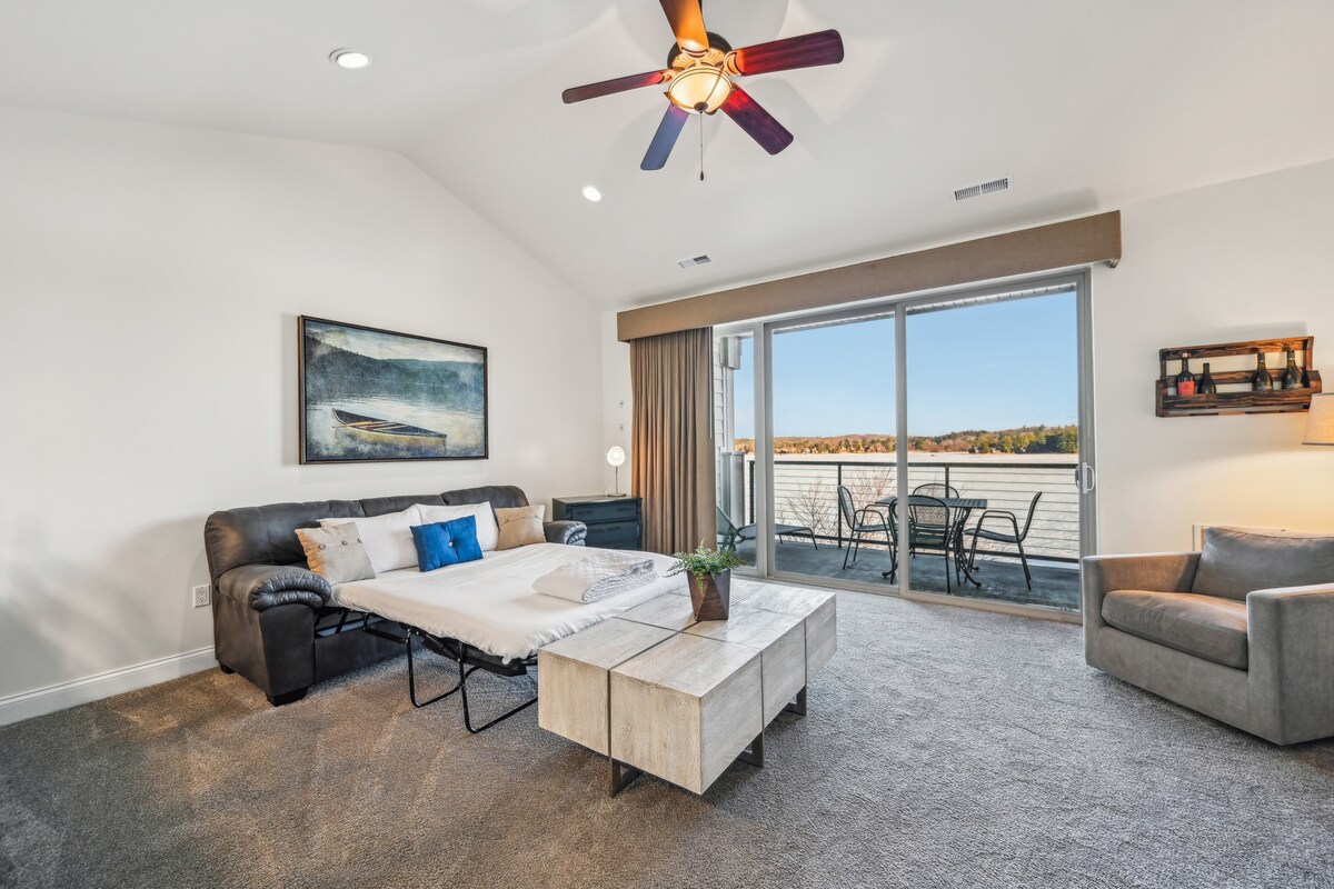 Disfruta de la vida junto al lago en nuestro lujoso apartamento frente al lago. Despiértate con un café por la mañana en el balcón con impresionantes vistas al lago Delton. Nuestro espacioso apartamento de 2 dormitorios y 2 baños cuenta con una hermosa suite principal con cama tamaño king, baño privado completo con bañera de hidromasaje y ducha a ras de suelo con 3 cabezales de ducha direccionales. Es la escapada perfecta para aquellos que quieren sentirse como si estuvieran en un mundo aparte, pero también a pocos minutos de toda la diversión y emoción de los Dells.