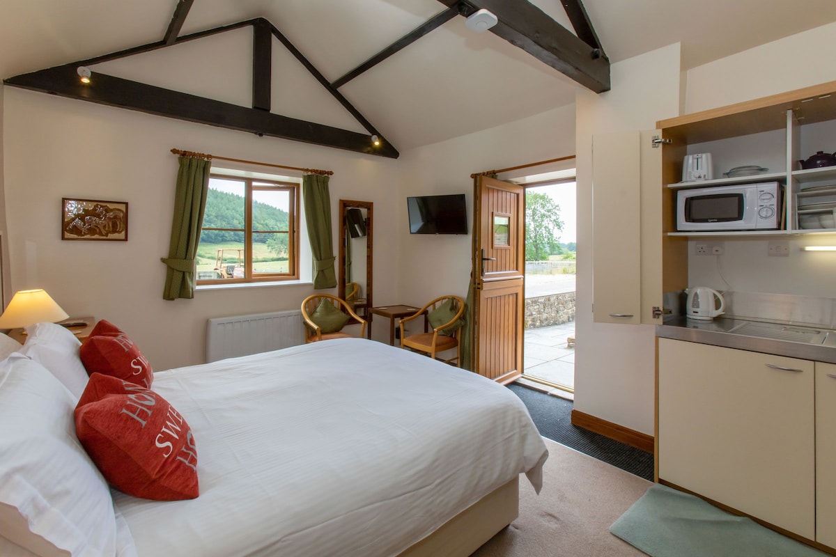 North York Moors Self-Catering Studio Room Relax in the charming Gowland Studio, a spacious ground-floor room with high beamed ceilings, set in a sunny south-facing courtyard at Rawcliffe House Farm. This self-contained studio features an en-suite bathroom, a hideaway kitchen for light meals, and comfortable furnishings. Enjoy 42 acres of open countryside, fresh air, and stunning North York Moors views—perfect for couples or solo travellers seeking a peaceful, scenic, and restorative escape.