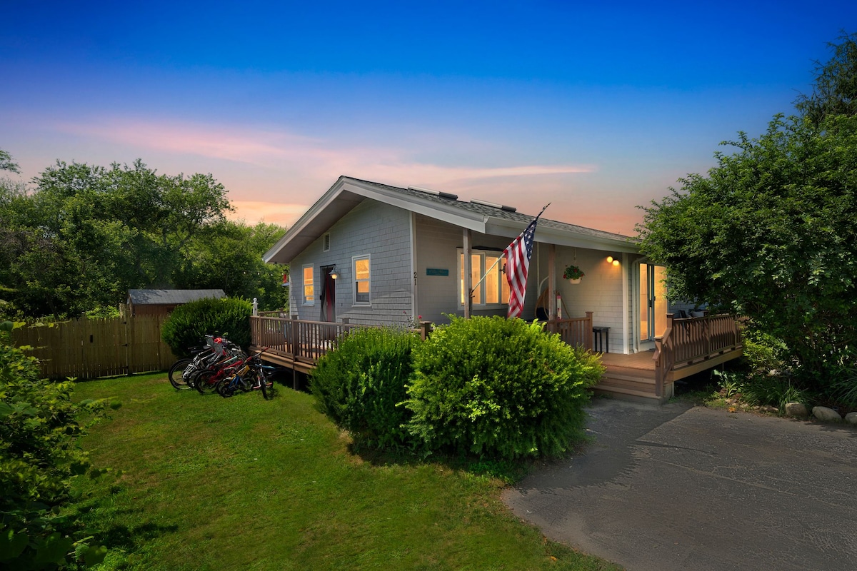 Gorgeous & peaceful 3-bedroom house w/ private yard adjacent to 25 acres of wilderness, huge wrap-around deck & off -street parking, 5-min drive to the beach or short bike ride. 3 bedrooms - bedroom 1: king bed - bedroom 2: queen over queen bunk - bedroom 3: double with twin bunk and twin trundle -gas fireplace - hot tub & out door shower -Lounge & gas fire pit on deck -outdoor dining table for 12 -fenced in yard w/ fire pit -Gas grill -Bikes, yard games & beach gear *dog friendly! (Pet fee)