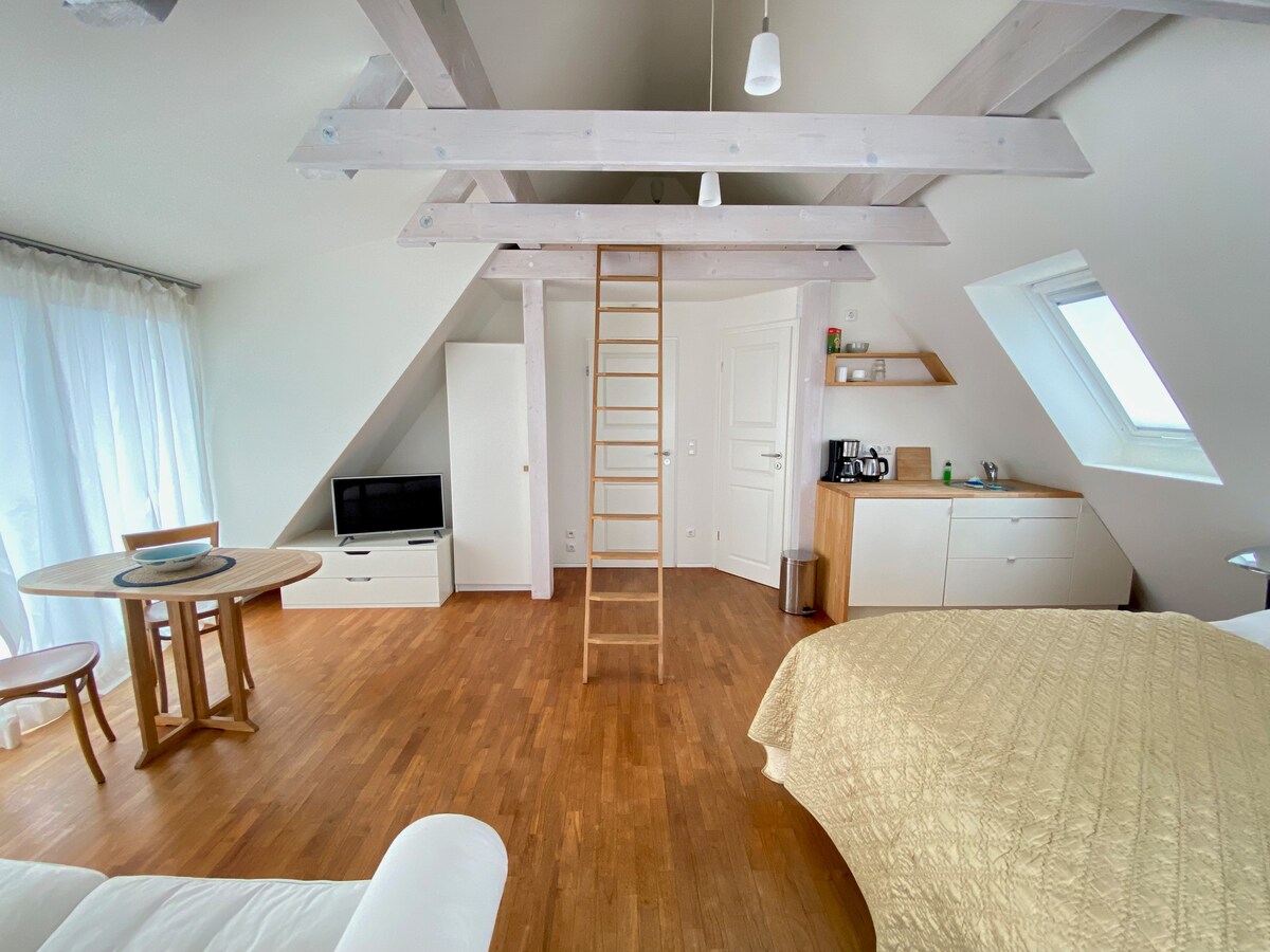 Luminoso y fresco apartamento tipo galería con fantásticas vistas al mar y balcón. Decorado con cariño. Tranquilo, situado justo enfrente de la hermosa playa de arena. Con grandes ventanales panorámicos y balcón en todo el ancho del apartamento. En la parte superior de la galería se puede ver el cielo estrellado desde la cama. La altura del techo en la cama es de 2,50 m, y solo es un poco más baja en la acogedora zona de estar.