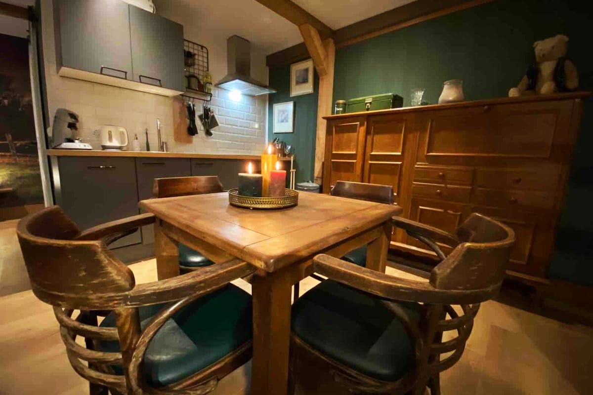 Bonito apartamento con 2 dormitorios. Completamente para ti. En la parte trasera, un amplio jardín de invierno con chimenea y, además, un jardín privado. Puedes calentar la sala del jardín con la chimenea. En invierno, puede hacer demasiado frío para sentarse allí solo con la chimenea. El baño tiene una bañera para 2 personas y una ducha doble. El baño también cuenta con lavadora y secadora. ¡Un apartamento maravilloso para alojarse por su cuenta y disfrutar de la tranquilidad!