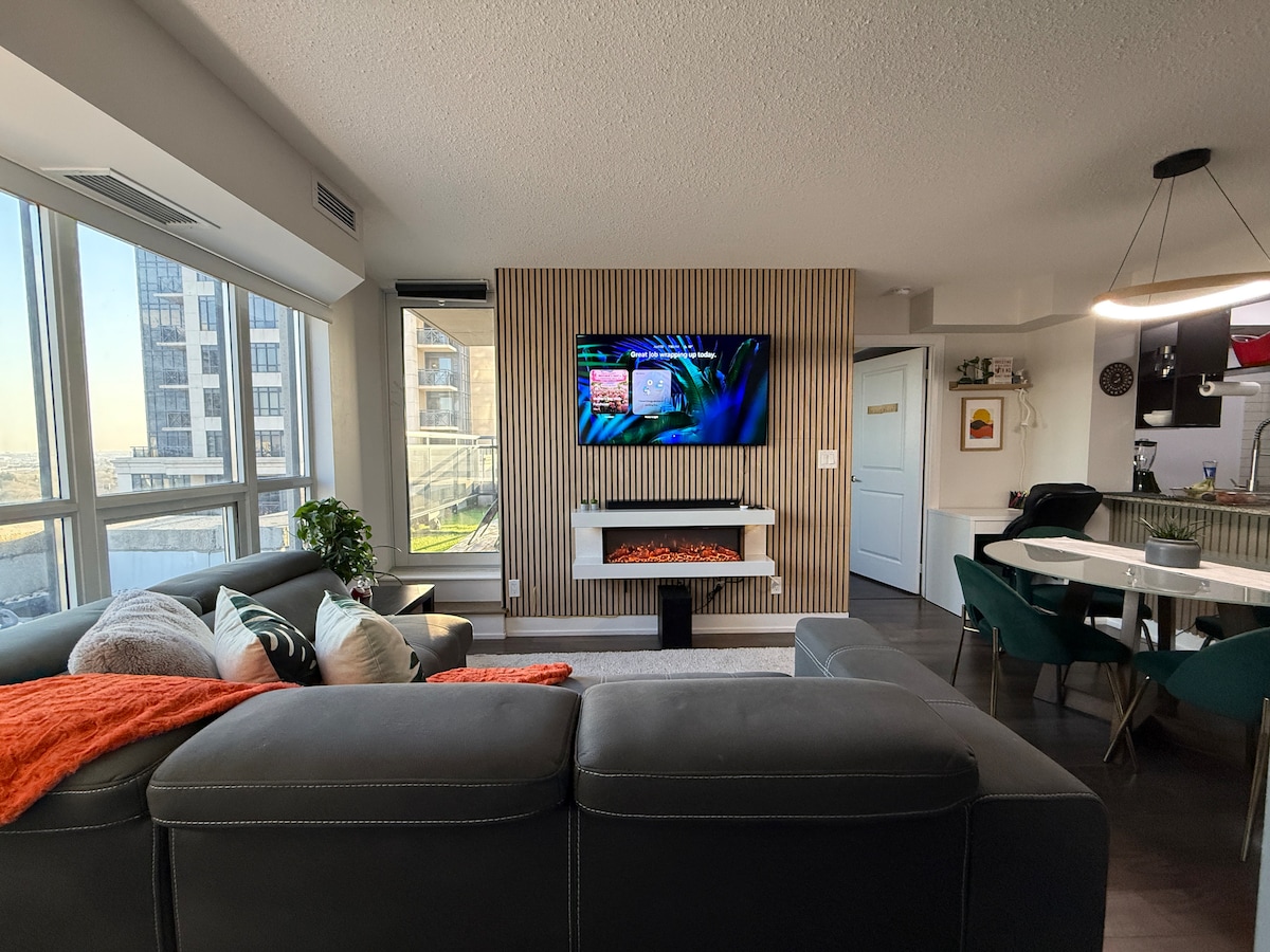 Bienvenido a este exquisito apartamento de 2 dormitorios y 2 baños, una mezcla de sofisticación moderna e impresionantes vistas. Ubicado en el corazón del centro de Mississauga, este alojamiento de esquina privada es todo lo que estás buscando. Todo en este alojamiento es nuevo. Nuestra prioridad es la limpieza y ofrecer una estancia de 5 estrellas. Se proporcionan todas las necesidades para que te sientas como en casa. Los servicios están disponibles para todos los huéspedes, incluyendo gimnasio, piscina, jacuzzi, sauna, sala de yoga, sala de música, sala de juegos y mucho más.