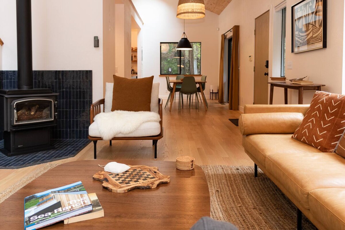 **¡Recientemente renovado/redecorado!** Esta casa fue llamada «The Ranch House» por su arquitecto Don Jacobs. Esta cabaña de los años 70 actualizada es una escapada al bosque con sensibilidad moderna. La casa está rodeada de secuoyas y tiene 2 grandes terrazas, 1 con chimenea de propano con amplios asientos, la otra con jacuzzi. El salón tiene ventanales con vistas al bosque y estufa de leña Morso. Se anima a los huéspedes a disfrutar de las rutas de senderismo, piscinas y servicios al aire libre. La casa tiene capacidad para 4 personas y cuenta con internet de fibra óptica.