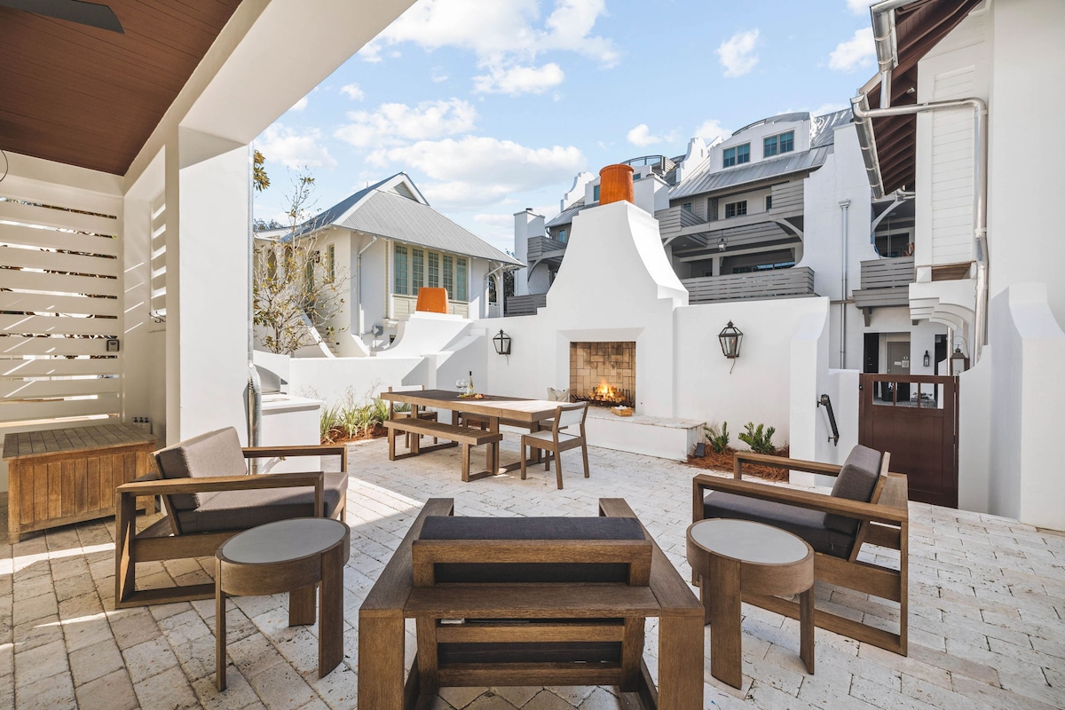 Sleeps 20! Brand new construction ON 30A in the heart of Old Seagrove! Just steps to the beach access, Seaside, restaurants & shops! 6-Seater LSV + 6 beach cruiser bikes provided COMPLIMENTARY (~$250/day value)! Huge private hot tub and heated pool with sun shelf and loungers, fire pit, outdoor kitchen, ping pong table, wet bar,. indoor fireplace, 7+ balconies, and multiple living + dining spaces! 7 king bedrooms! STUNNING 4th floor rooftop deck with expansive Gulf views!