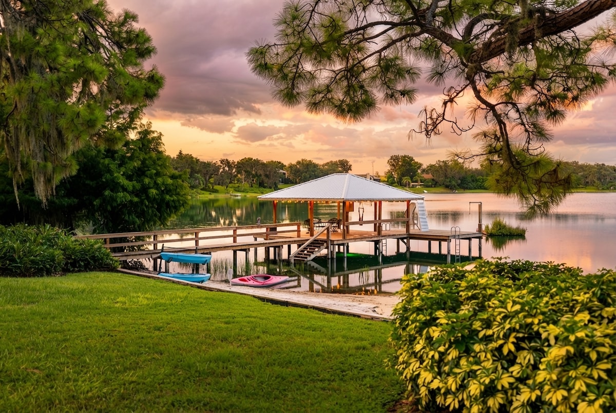 Retiro frente al lago en Florida con mesa de billar y muelle