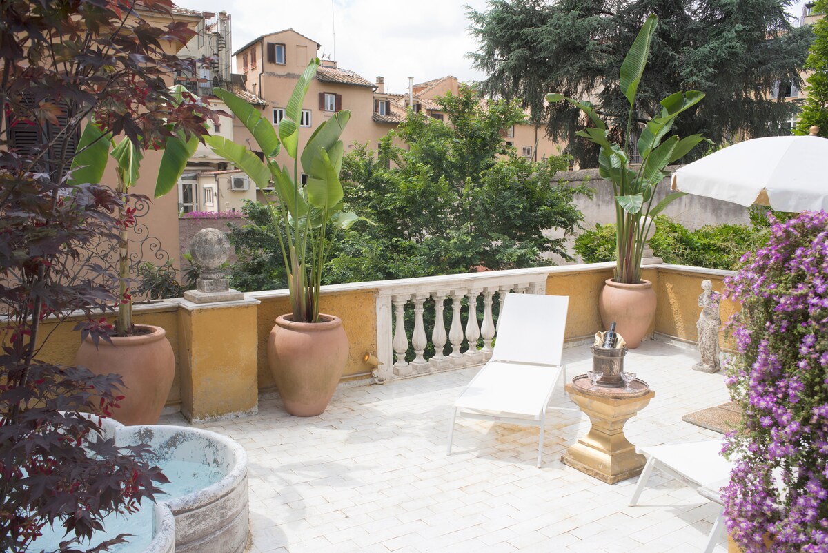 In the famous and picturesque San Giovanni della Malva Square, the heart of the nightlife in Trastevere. The two floors exclusive Palace is completely dedicated to our guests. At the first floor there is a 40 square meters suite furnished in an elegant style, with double bed, a comfortable lounge and a bathroom with shower. At the second floor, a 20 square meter room welcomes you with double bed and private bathroom and access to the double level terrace.
