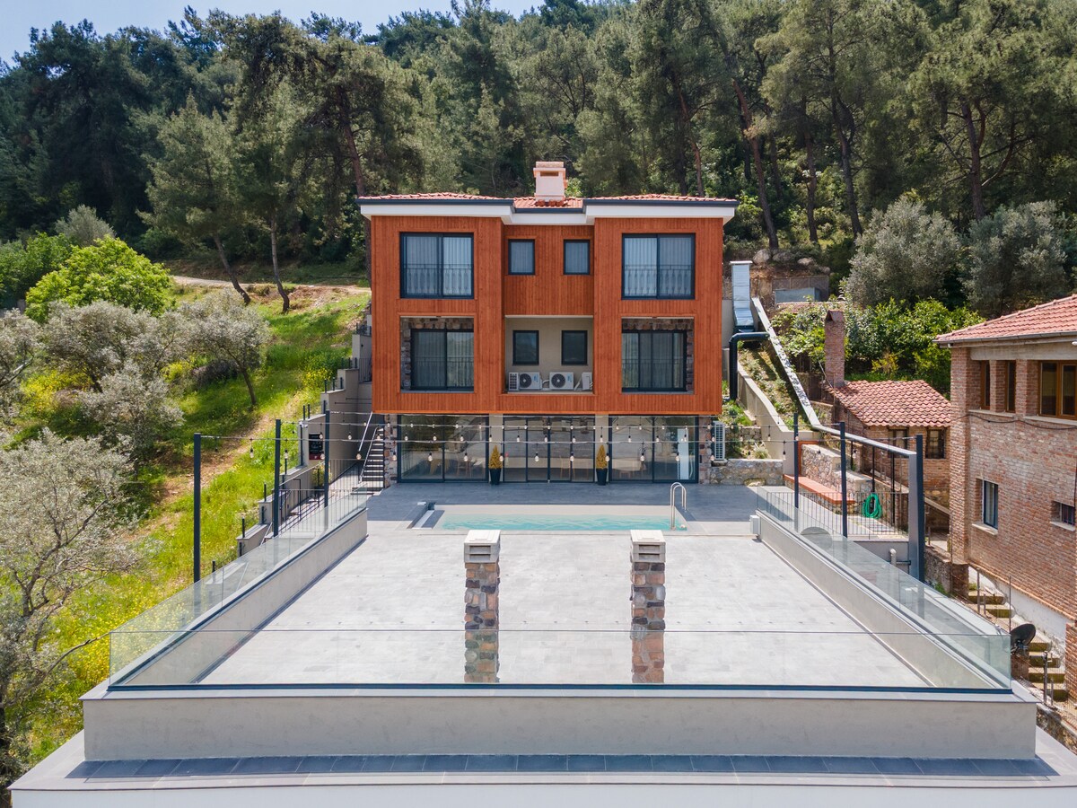 En la fachada de nuestra villa, que está apoyada en las laderas de Tavşantepe cubiertas de olivos, podrá disfrutar de la paz viendo todos los tonos de verde en nuestra piscina (agua salada), piscina de spa, nogales y olivos y varios árboles frutales. Mientras que los sonidos de los gallos, pollos, ruiseñores y ardillas acompañan sus mañanas, las golondrinas le ofrecerán un espectáculo visual con sus bailes por las tardes.