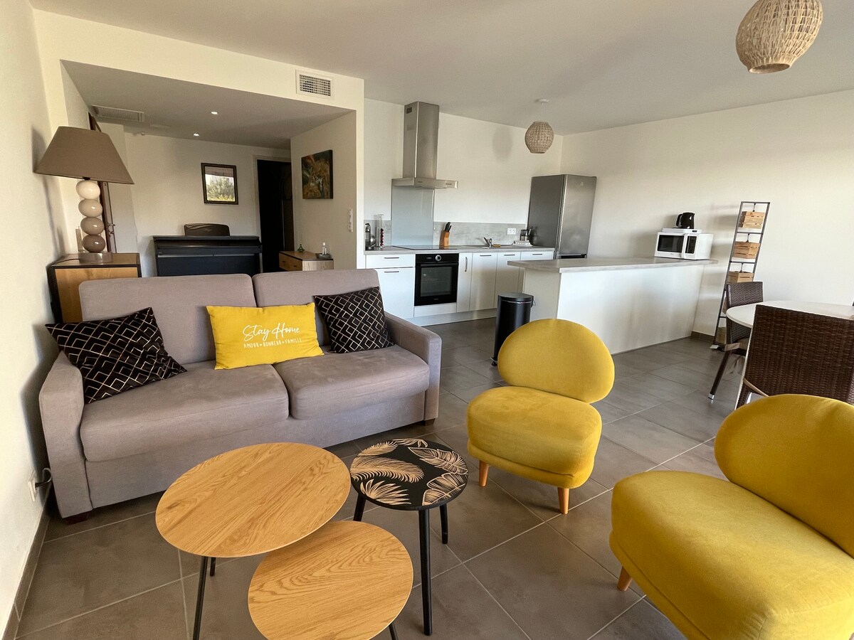 Bonito apartamento nuevo, tranquilo, en una pequeña zona a 2 minutos de las playas y de las tiendas. 46m2 totalmente decorados con el tema "BLANCO PURETE" que incluye: una cocina totalmente equipada (LV, Horno, ...), una sala de estar con gran sofá cama, una gran habitación con vestidor, baño con ducha a ras de suelo, terraza de 21 m2 y jardín de 30 m². Ideal para 4 personas. Se proporcionan ropa de cama de alta gama, sábanas y ropa de cama. Limpieza incluida. Acceso desde Ajaccio 20 min. aprox.