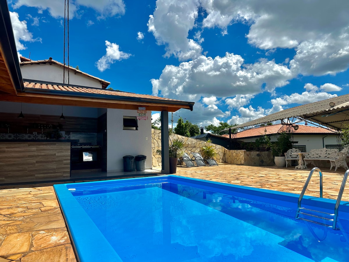 Finais de Semana Linda Chácara em Serra Negra * 6 dormitórios com ventilador de teto, até 20 pessoas * 9 banheiros * 3 banheiras de hidromassagem * Sala com lareira * Cozinha * 2 churrasqueiras * Fogão à lenha * Forno de barro para pizza * Piscina climatizada (aquecimento solar) com cascata e hidro * Campo de futebol e vôlei * Salão de Jogos (sinuca, pebolim e ping pong * Wi-Fi Fibra óptica * Canil * Sauna seca e úmida * Lago para pesca tilápia * Asfalto até a porta * Playground para crianças