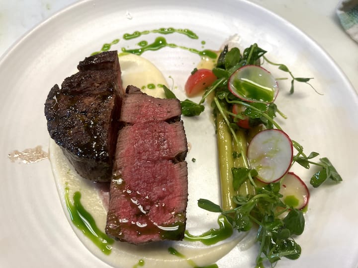 entrante: Filet au pouvre- corteza de pimienta, salsa de pimienta, puré de patata, brócoli