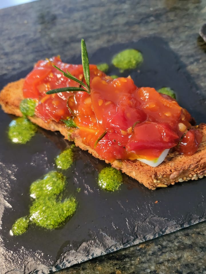 Disfruta de una selección completa de tapas tradicionales, como anchoas marinadas, tabla de queso y jamón y croquetas mixtas para empezar. Sigue con el clásico «frito mallorquín» y la tortilla de patatas. Los platos principales incluyen calamares a la andaluza y un pincho con sobrasada, queso de cabra y miel. Termina con un delicioso «gato» mallorquín de almendras con helado.
