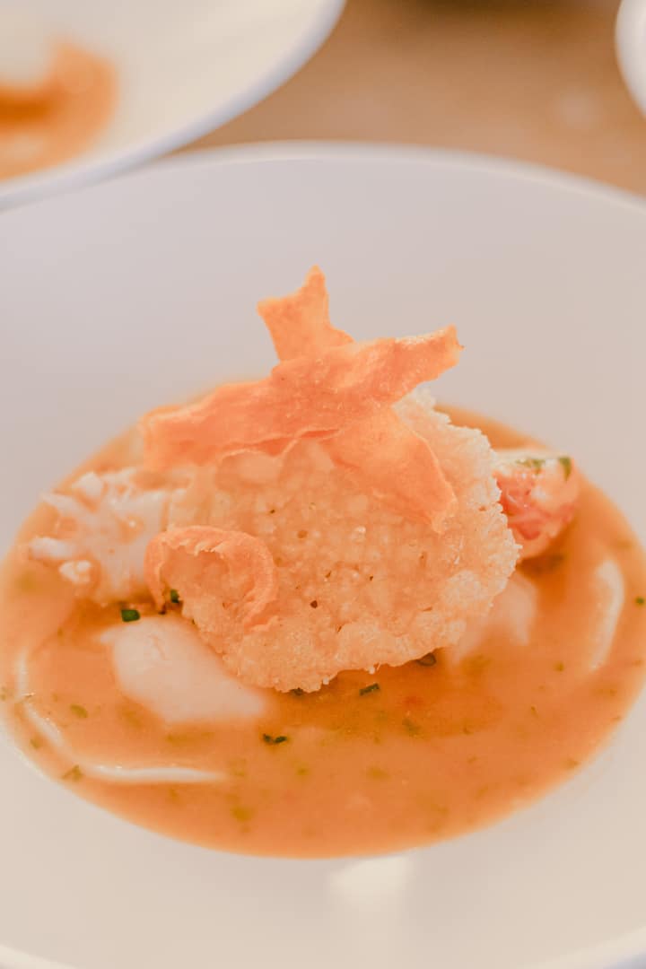AGUACATE ASADO RELLENO DE CEVICHE, SALMOREJO DE TOMATE ASADO Y FRESAS.