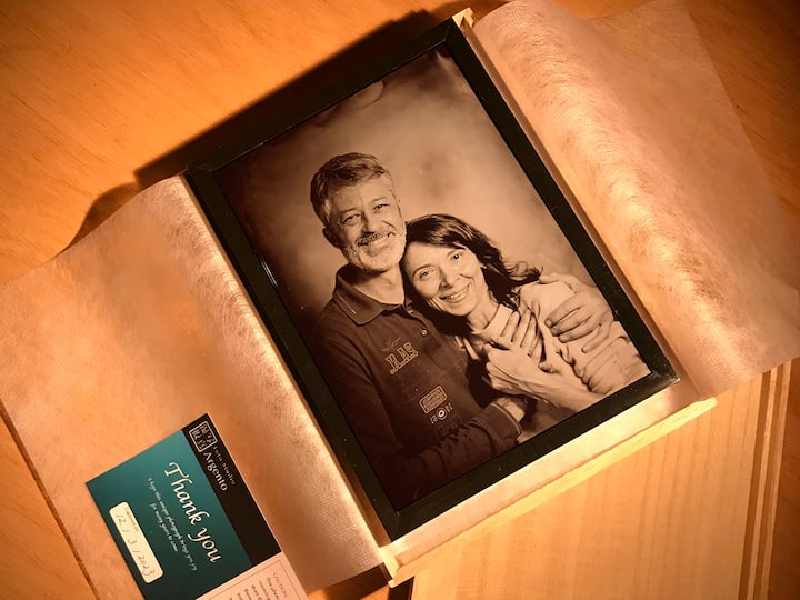 La sesión dura 40 minutos. Dado que se requiere procesamiento, le pedimos que regrese aproximadamente 90 minutos más tarde. Tu ferrotipo se entrega enmarcado y en una caja de madera. Relájate en una cafetería cercana mientras esperas.