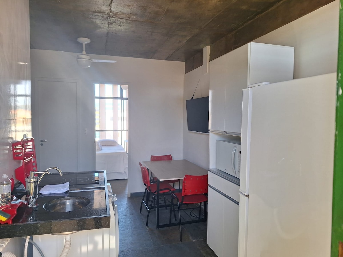 Cobertura de una habitación en el centro. Aire acondicionado en la habitación. Ventilador de techo en el dormitorio y sala de estar. Área abierta de la azotea de uso exclusivo. Cocina muy equipada. Lavadora y secadora, Smartv. Las camas se pueden configurar para parejas o solteros. En la región central de Sete Lagoas, cerca de Lagoa Paulino (lago principal de la ciudad) Edificio muy familiar, cuarto piso con ascensor. Cuenta con plaza de garaje, disponible previa consulta. Tenemos otro apto en el mismo edificio.